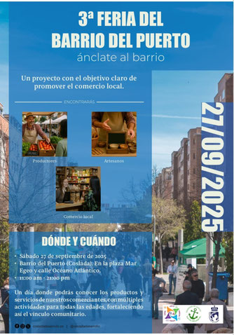 Ya está todo listo para la 3ª Feria del Comercio del Barrio del Puerto. Productores, artesanos y comerciantes locales darán a conocer sus productos, en una jornada que contará con actividades variadas. 📅27 de septiembre, de 11:00 a 21:00. 📍Plaza Mar Egeo y calle Océano Atlántico.